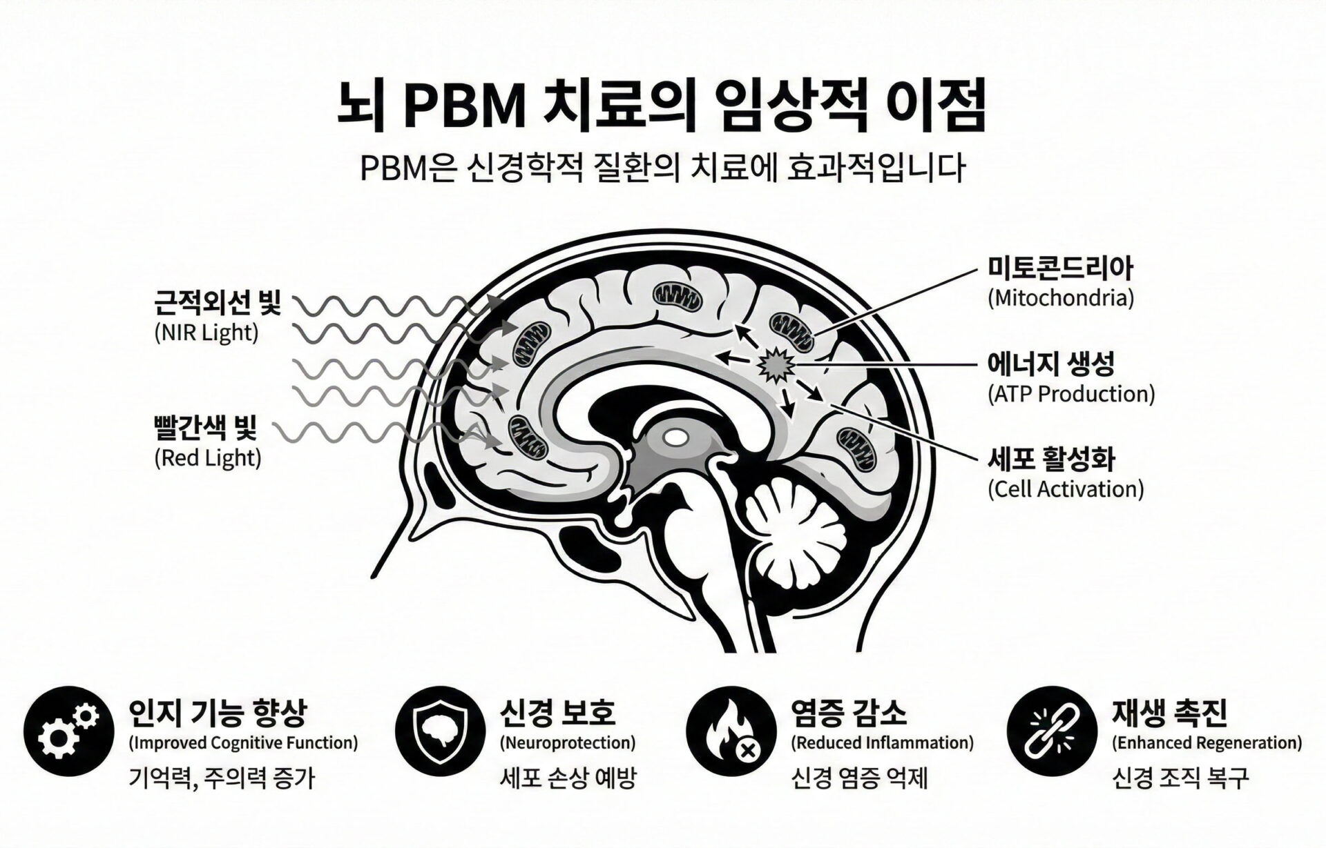 PBM은 신경 세포의 대사 능력을 향상시키고, 행동 수준에서 인지 기능 향상, 항우울 효과 및 수면 개선을 포함한 다양한 임상적 이점을 제공하는 것으로 나타났습니다.