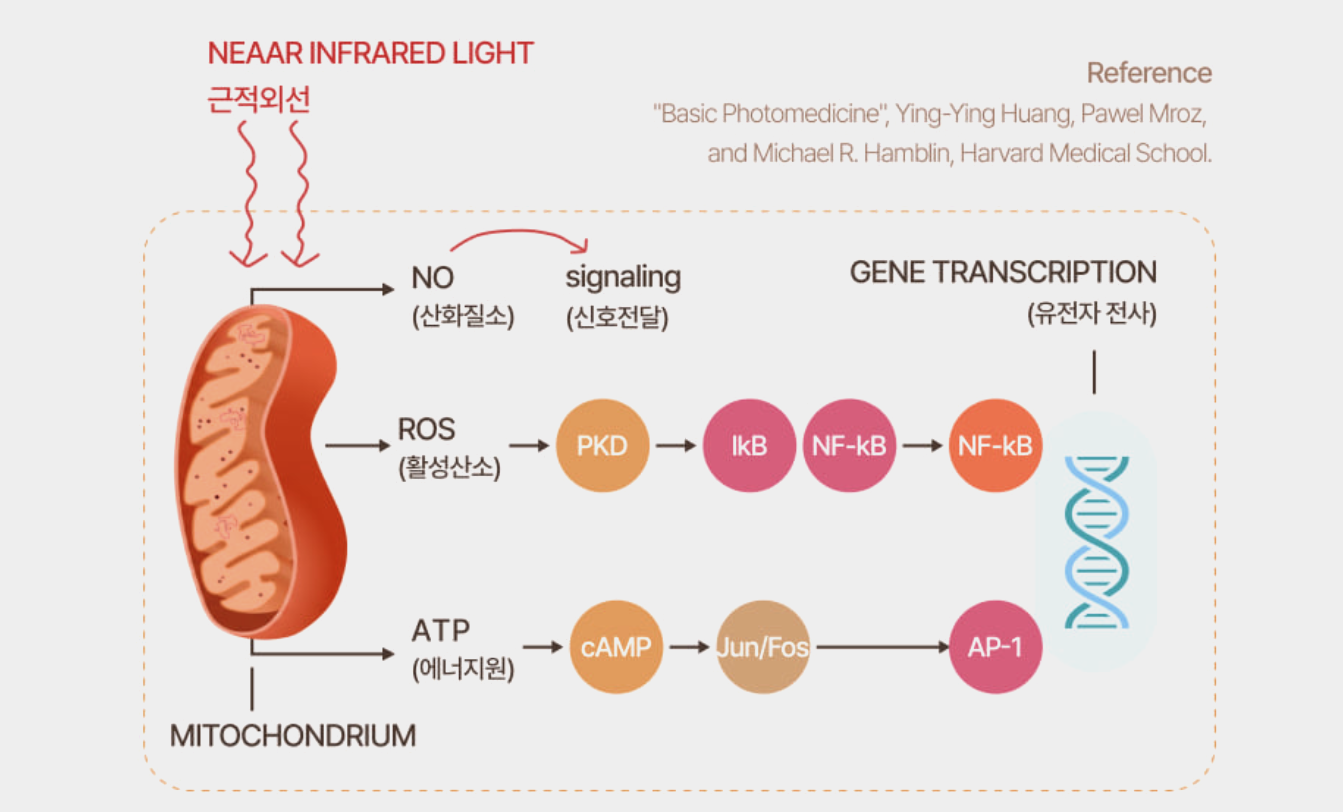 2. 세포 에너지 활성 (Cellular Activation): 미토콘드리아의 CCO(Cytochrome C Oxidase)가 빛을 흡수하여 ATP 생성을 촉진합니다. 이는 손상된 조직의 회복을 위한 에너지원을 공급합니다.