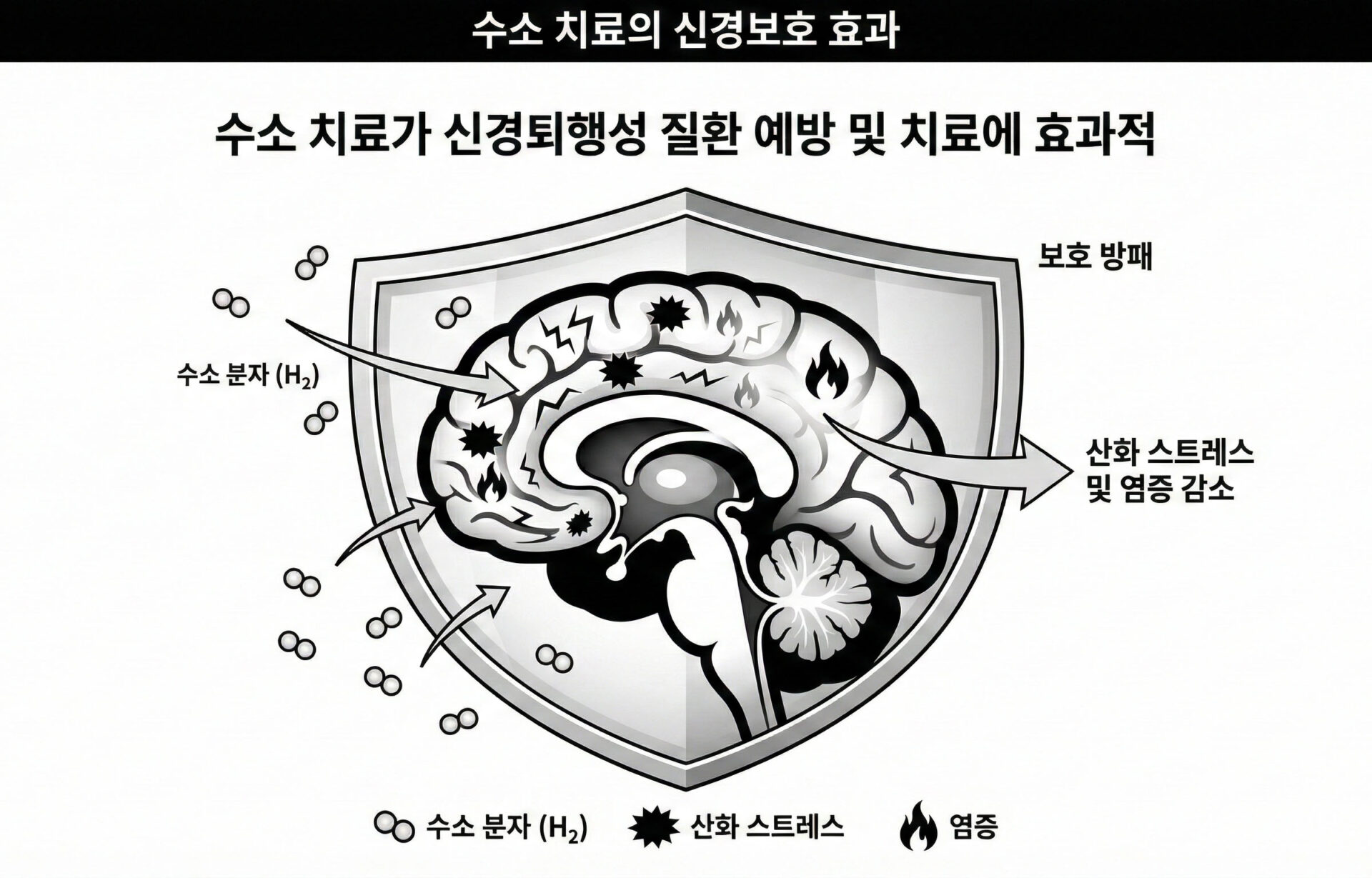 수소는 H₂ 가스 흡입, H₂ 용해수 섭취, H₂ 용해염 주입 등 세 가지 방법으로 투여되었으며, 주로 고독성 산소 라디칼(OH·)과 과산화질소를 선택적으로 감소시켜 작용했습니다.