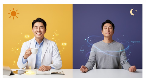 At 8 a.m. mitochondria are explicitly in ATP-production mode; at 8 p.m. they favor antioxidant and regenerative programs. The same 660 nm photon can trigger distinct biochemical cascades depending on the cell’s schedule.